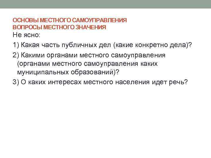 ОСНОВЫ МЕСТНОГО САМОУПРАВЛЕНИЯ ВОПРОСЫ МЕСТНОГО ЗНАЧЕНИЯ Не ясно: 1) Какая часть публичных дел (какие конкретно дела)? 2) Какими органами местного самоуправления (органами местного самоуправления каких муниципальных образований)? 3) О каких интересах местного населения идет речь?