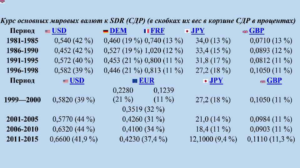 Вторая поправка к Уставу МВФ (вступила в силу в 1978 г. ), зафиксировала следующие изменения: a. отменяется официальная цена золота; Доли валют в валютной корзине СДР, % b. официально закрепляется система плавающих курсов; c. Валюта повышаются требования к координации внутренней и внешней 2006 – 2010 гг. 2011 – 2015 гг. экономической политики стран — членов МВФ; Доллар СШАСпециальные права заимствования ("spesial drawing rights"), СДР 44 41, 9 d. Евро - международный резервный актив, эмитируемый МВФ и 34 37, 4 распределяется между странами-членами пропорционально их квотам в МВФ. Фунт стерлингов 11 11. 3 «…единица специальных прав заимствования Японская иена 11 9, 4 приравнивается к 0, 888671 грамма чистого золота, а сумма валюты, подлежащей выплате …определяется … на основе стоимости валюты в специальных правах заимствования на дату погашения обязательства…» 22