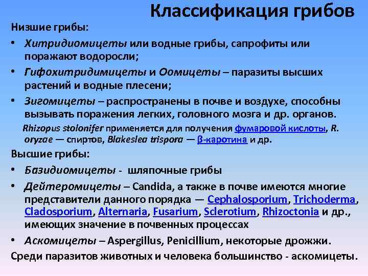 Классификация грибов Низшие грибы: • Хитридиомицеты или водные грибы, сапрофиты или поражают водоросли; • Гифохитридимицеты и Оомицеты – паразиты высших растений и водные плесени; • Зигомицеты – распространены в почве и воздухе, способны вызывать поражения легких, головного мозга и др. органов. Rhizopus stolonifer применяется для получения фумаровой кислоты, R. oryzae — спиртов, Blakeslea trispora — β-каротина и др. Высшие грибы: • Базидиомицеты - шляпочные грибы • Дейтеромицеты – Candida, а также в почве имеются многие представители данного порядка — Cephalosporium, Trichoderma, Cladosporium, Alternaria, Fusarium, Sclerotium, Rhizoctonia и др. , имеющих значение в почвенных процессах • Аскомицеты – Aspergillus, Penicillium, некоторые дрожжи. Среди паразитов животных и человека большинство - аскомицеты.