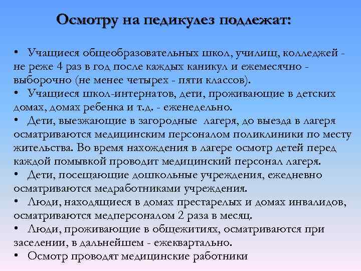 Осмотру на педикулез подлежат: • Учащиеся общеобразовательных школ, училищ, колледжей не реже 4 раз в год после каждых каникул и ежемесячно выборочно (не менее четырех - пяти классов). • Учащиеся школ-интернатов, дети, проживающие в детских домах, домах ребенка и т. д. - еженедельно. • Дети, выезжающие в загородные лагеря, до выезда в лагеря осматриваются медицинским персоналом поликлиники по месту жительства. Во время нахождения в лагере осмотр детей перед каждой помывкой проводит медицинский персонал лагеря. • Дети, посещающие дошкольные учреждения, ежедневно осматриваются медработниками учреждения. • Люди, находящиеся в домах престарелых и домах инвалидов, осматриваются медперсоналом 2 раза в месяц. • Люди, проживающие в общежитиях, осматриваются при заселении, в дальнейшем - ежеквартально. • Осмотр проводят медицинские работники