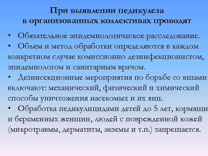 При выявлении педикулеза в организованных коллективах проводят • Обязательное эпидемиологическое расследование. • Объем и метод обработки определяются в каждом конкретном случае комиссионно дезинфекционистом, эпидемиологом и санитарным врачом. • Дезинсекционные мероприятия по борьбе со вшами включают: механический, физический и химический способы уничтожения насекомых и их яиц. • Обработка педикулицидами детей до 5 лет, кормящи и беременных женщин, людей с поврежденной кожей (микротравмы, дерматиты, экземы и т. п. ) запрещается.