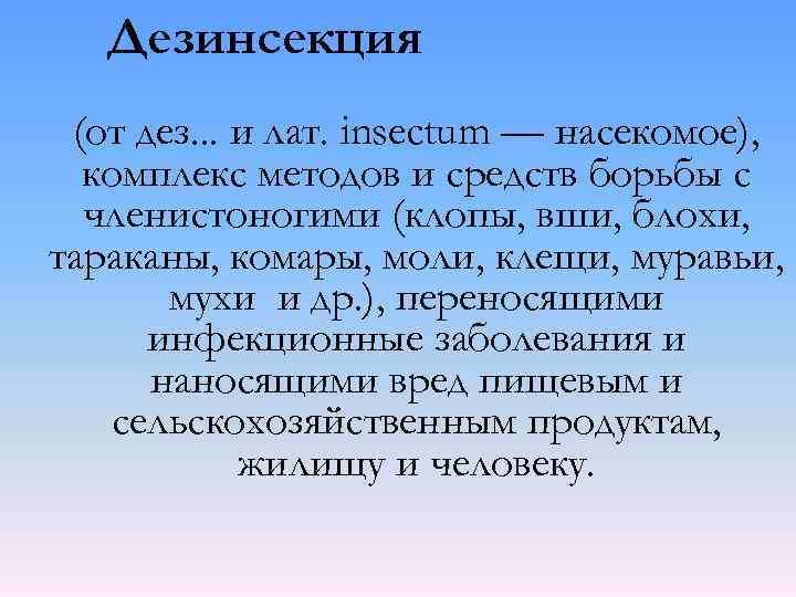 Дезинсекция (от дез. . . и лат. insectum — насекомое), комплекс методов и средств борьбы с членистоногими (клопы, вши, блохи, тараканы, комары, моли, клещи, муравьи, мухи и др. ), переносящими инфекционные заболевания и наносящими вред пищевым и сельскохозяйственным продуктам, жилищу и человеку.