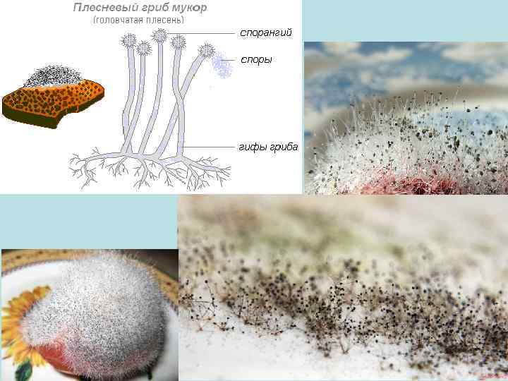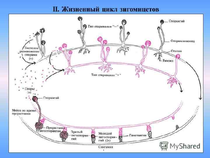 1 – хлеб; 2 – гиф; 3 – ризоиды; 4 – спорангиофоры; 5 – спорангий; 6 – споры, выпускаемые из спорангия; 7 – бесполые споры; 8 – прорастающая спора; 9 – гифы противоположного пола; 10 – гаметангий; 12 – делящийся гаметангий; 13 – зигоспора; 14 – прорастающая зигоспора; 15 – половые споры.