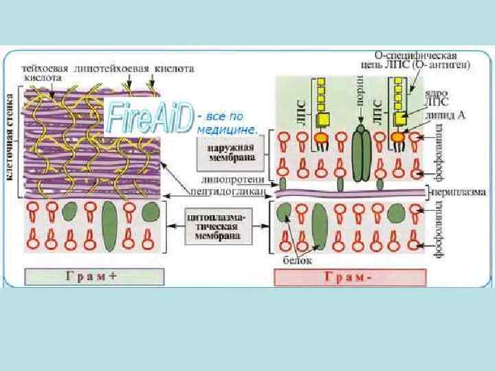 Грамотрицательные эубактерии Компоненты Грамположите внутренний внешний слой клеточной льные слой (наружная стенки эубактерии (пептидоглик клеточная ановый) мембрана) Пептидогликан + + – Тейхоевые + – – кислоты Полисахариды + – + Белки ± – + Липиды ± – + Липополисахар – – + иды Липопротеины – ± +