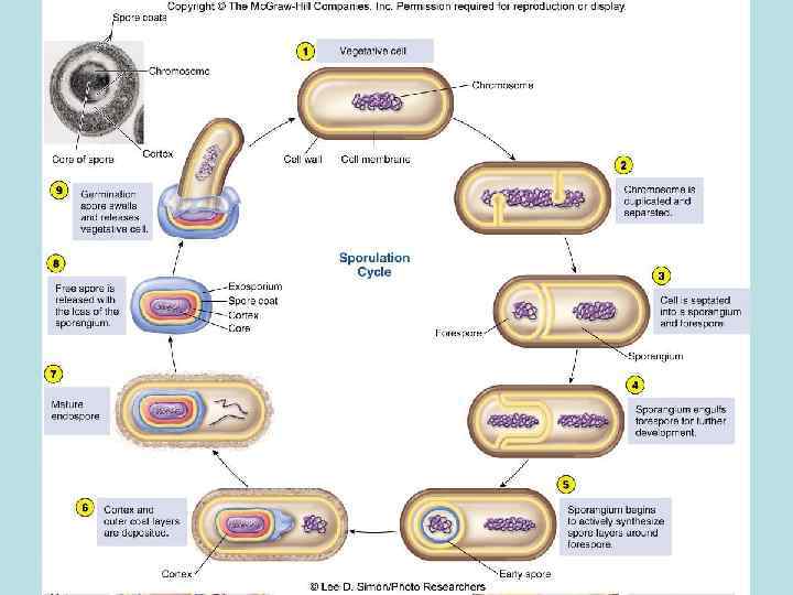 Цикл развития эндоспоры 1) нуклеоид; 2) цитоплазма; 3) ЦПМ; 4) клеточная стенка; 5) споровая септа; 6) наружная мембрана споры; 7) внутренняя мембрана споры; 8) кортекс; 9) оболочка споры I) вегетативная клетка; II) инвагинация ЦПМ; III) образование споровой перегородки (септы); IV) формирование двойной мембранной системы образующейся проспоры; V) сформированная проспора; VI) формирование кортекса; VII) формирование покровов споры; VIII) лизис материнской клетки; IX) свободная зрелая спора; Х) прорастание споры;
