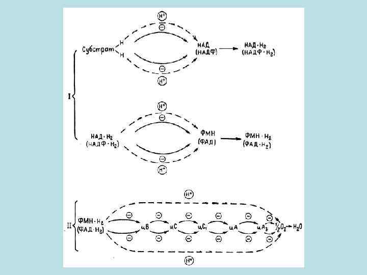 Вторичные – ФАД (флавинадениндинуклеотид) или ФМН (флавинмононуклеотид) НАД Н 2 + ФАД → ФАД Н 2 + НАД ФАД Н 2 + 1/2 О 2 → ФАД + Н 2 О