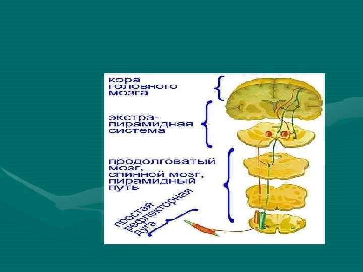 • • Уровень «А» - уровень тонуса, а также статической и динамической выносливости и примитивной координации (рубро-спинальный, мозжечковопaллидарный уровень палеокинетических регуляций). Уровень «А» полностью определяет тонус мышц туловища и шеи (осанка), а также отвечает за возбудимость мышц конечностей. Самый древний в филогенетическом отношении — уровень «А» , который отвечают за построение движений на этом уровне: «красное ядро» выступает «высшей» регулирующей инстанцией этого уровня построения движений, к которому имеют отношение и другие подкорковые структуры. Система данных структур обеспечивает поступление и анализ проприоцептивной информации от мышц, удержание определенной позы, некоторые быстрые ритмические вибрационные движения (например, вибрато у скрипачей), а также ряд непроизвольных движений (дрожь от холода, вздрагивание, стучание зубами от страха). Уровень «А» у человека практически никогда не бывает ведущим уровнем построения движений.