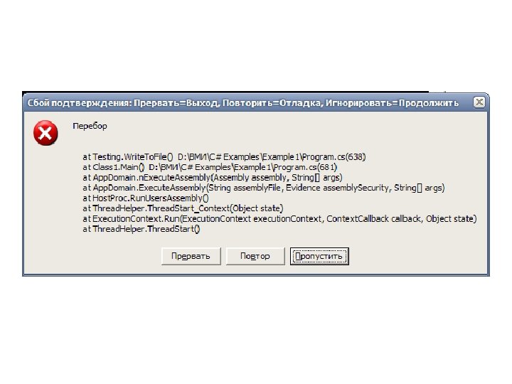 Утверждения Assert • В C# эта схема поддерживается тем, что классы Debug и Trace имеют метод Assert, аргументом которого является утверждение. Если истинно булево выражение в Assert, то вычисления продолжаются, не оказывая никакого влияния на нормальный ход вычислений. Если оно ложно, то корректность вычислений под сомнением, их выполнение приостанавливается и появляется окно с уведомлением о произошедшем событии,