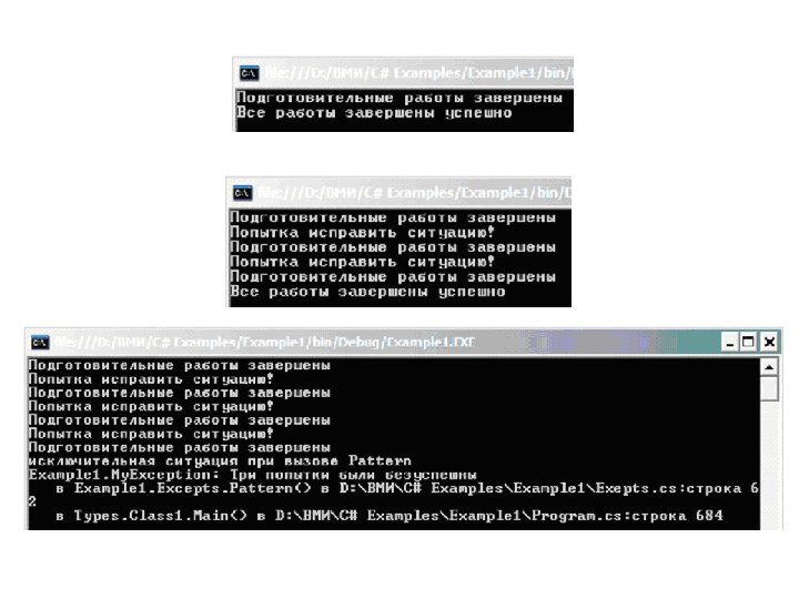 throw(new My. Exception("Все попытки Pattern безуспешны", me)); static public void Print. Properties(Exception e) { Console. Write. Line("Свойства исключения: "); Console. Write. Line("Target. Site = {0}", e. Target. Site); Console. Write. Line("Source = {0}", e. Source); Console. Write. Line("Message = {0}", e. Message); if (e. Inner. Exception == null) Console. Write. Line("Inner. Exception = null"); else Console. Write. Line("Inner. Exception = {0}", e. Inner. Exception. Message); Console. Write. Line("Stack. Trace = {0}", e. Stack. Trace); Console. Write. Line("Get. Base. Exception = {0}", e. Get. Base. Exception()); }