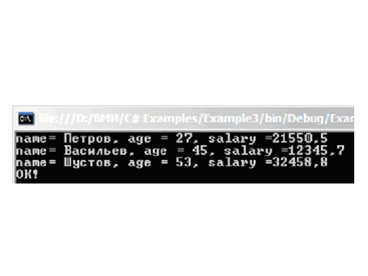 public void Test. Person() { One. Link. Stack<int> stack 1 = new One. Link. Stack<int>(); One. Link. Stack<string> stack 2 = new One. Link. Stack<string>(); Array. Up. Stack<double> stack 3 = new Array. Up. Stack <double>(10); Array. Up. Stack<Person> stack 4 = new Array. Up. Stack<Person>(7); stack 2. put("Петров"); stack 2. put("Васильев"); stack 2. put("Шустов"); stack 1. put(27); stack 1. put(45); stack 1. put(53); stack 3. put(21550. 5); stack 3. put(12345. 7); stack 3. put(32458. 8); stack 4. put(new Person(stack 2. item(), stack 1. item(), stack 3. item())); stack 1. remove(); stack 2. remove(); stack 3. remove(); stack 4. put(new Person(stack 2. item(), stack 1. item(), stack 3. item())); Person pers = stack 4. item(); pers. Print. Person(); stack 4. remove(); if (stack 4. empty()) Console. Write. Line("OK!"); }
