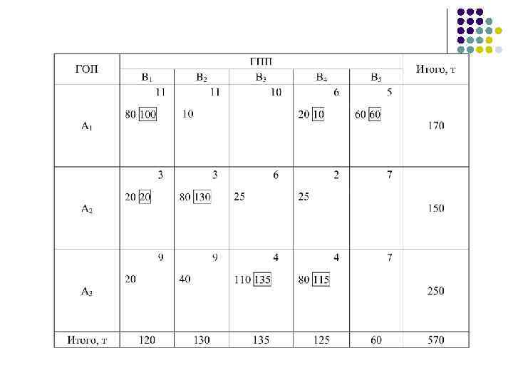 Маршрутизация перевозок массовых грузов Алгоритм решения задачи: l С помощью распределительного метода находятся оптимальные размеры и направления грузопотоков по каждому виду груза. (Обычно эту часть задачи решают сами клиенты, а результаты решения в виде заявок на перевозку грузов передаются в АТП).