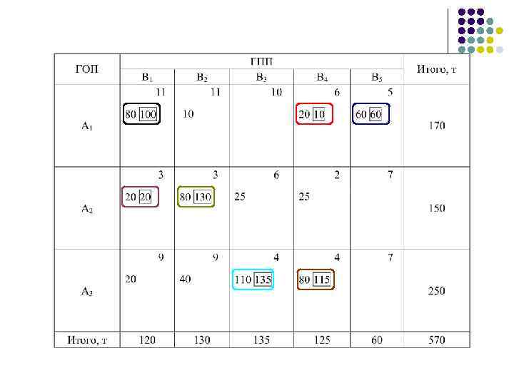Маршрутизация перевозок массовых грузов l Для каждой клетки таблицы, загруженной величиной объема перевозок, строится контур таким образом, чтобы углы контура лежали поочередно в клетках загруженных грузопотоками и загруженных провозной способностью порожнего состава. Полученные таким образом контуры показывают кольцевые маршруты движения подвижного состава, мощность грузопотока которых определяет наименьшая величина загрузок клеток контура.