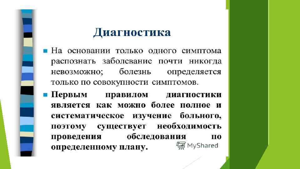 Критериями болезней являются: -внешние признаки болезни, или симптомы, они складываются из субъективных жалоб пациентов (например на слабость, боль, тошноту и т. д. ), и результата его объективного обследования (лабораторных и инструментальных методов).