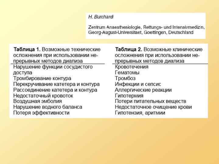 Возможные осложнения • Гипотензия – из-за быстрого снижения объема крови, осмолярности, выведения вазоактивных веществ • Аритмии – из-за быстрого изменения состава электролитов • Синдром нарушенного равновесия (дизэквилибрис-синдром) – при быстром выведении мочевины из крови и внеклеточной жидкости снижается осмолярность крови, в то же время из клеток мочевина выводится медленнее, из-за большей осмолярности в клетки начинает поступать вода. Может приводить к отеку мозга и судорогам после гемодиализа • Гипоксемия – повышение потребления кислорода для метаболизма ацетата • Кровотечение