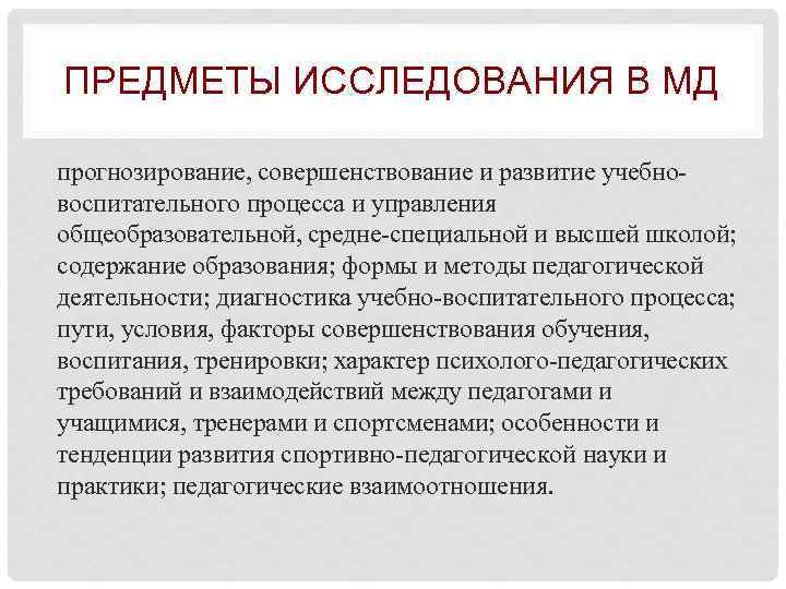 ПРЕДМЕТЫ ИССЛЕДОВАНИЯ В МД прогнозирование, совершенствование и развитие учебно воспитательного процесса и управления общеобразовательной, средне специальной и высшей школой; содержание образования; формы и методы педагогической деятельности; диагностика учебно воспитательного процесса; пути, условия, факторы совершенствования обучения, воспитания, тренировки; характер психолого педагогических требований и взаимодействий между педагогами и учащимися, тренерами и спортсменами; особенности и тенденции развития спортивно педагогической науки и практики; педагогические взаимоотношения.