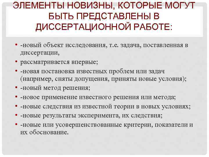 ЭЛЕМЕНТЫ НОВИЗНЫ, КОТОРЫЕ МОГУТ БЫТЬ ПРЕДСТАВЛЕНЫ В ДИССЕРТАЦИОННОЙ РАБОТЕ: • новый объект исследования, т. е. задача, поставленная в диссертации, • рассматривается впервые; • новая постановка известных проблем или задач (например, сняты допущения, приняты новые условия); • новый метод решения; • новое применение известного решения или метода; • новые следствия из известной теории в новых условиях; • новые результаты эксперимента, их следствия; • новые или усовершенствованные критерии, показатели и их обоснование.