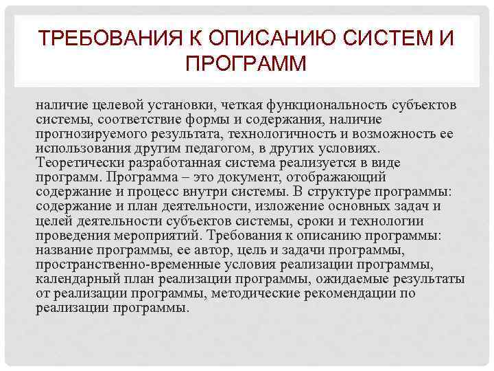 ТРЕБОВАНИЯ К ОПИСАНИЮ СИСТЕМ И ПРОГРАММ наличие целевой установки, четкая функциональность субъектов системы, соответствие формы и содержания, наличие прогнозируемого результата, технологичность и возможность ее использования другим педагогом, в других условиях. Теоретически разработанная система реализуется в виде программ. Программа – это документ, отображающий содержание и процесс внутри системы. В структуре программы: содержание и план деятельности, изложение основных задач и целей деятельности субъектов системы, сроки и технологии проведения мероприятий. Требования к описанию программы: название программы, ее автор, цель и задачи программы, пространственно временные условия реализации программы, календарный план реализации программы, ожидаемые результаты от реализации программы, методические рекомендации по реализации программы.