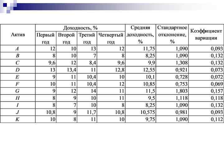 В частности, если в качестве меры риска выбрано среднее квадратическое отклонение, то его значение для портфеля, содержащего k активов, может быть найдено по формуле где di – доля i-гo актива в портфеле; i – вариация доходности i-го актива; rij – коэффициент корреляции между ожидаемыми доходностями iгo и j-го активов.