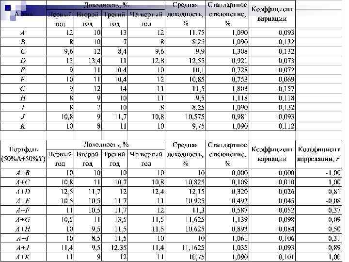 Пример 4. В табл. приведены статистические данные о доходности активов А, В, С, D за последние 4 года. Актив А имеет наименьшую доходность по сравнению с другими активами. Если в качестве меры риска использовать среднее квадратическое отклонение, то представленные активы имеют одинаковую степень риска, поэтому может сложиться впечатление, что для комплектования портфеля их можно брать в любой комбинации. Рассмотрим возможные варианты, когда формируется портфель из двух активов, причем 50% в стоимости портфеля составляет один актив и 50% – другой.