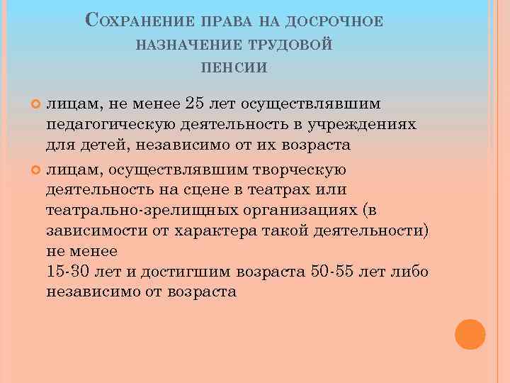 СОХРАНЕНИЕ ПРАВА НА ДОСРОЧНОЕ НАЗНАЧЕНИЕ ТРУДОВОЙ ПЕНСИИ лицам, не менее 25 лет осуществлявшим педагогическую деятельность в учреждениях для детей, независимо от их возраста лицам, осуществлявшим творческую деятельность на сцене в театрах или театрально зрелищных организациях (в зависимости от характера такой деятельности) не менее 15 30 лет и достигшим возраста 50 55 лет либо независимо от возраста