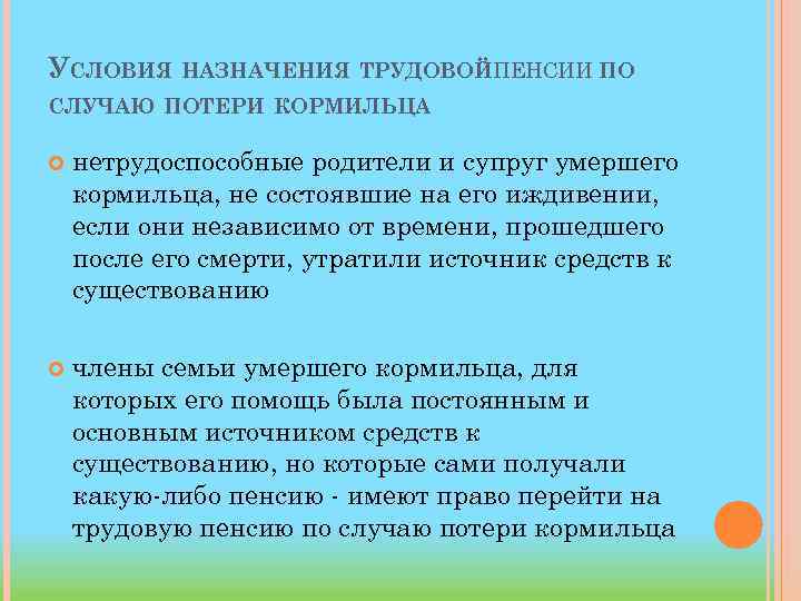 УСЛОВИЯ НАЗНАЧЕНИЯ ТРУДОВОЙПЕНСИИ ПО СЛУЧАЮ ПОТЕРИ КОРМИЛЬЦА нетрудоспособные родители и супруг умершего кормильца, не состоявшие на его иждивении, если они независимо от времени, прошедшего после его смерти, утратили источник средств к существованию члены семьи умершего кормильца, для которых его помощь была постоянным и основным источником средств к существованию, но которые сами получали какую либо пенсию имеют право перейти на трудовую пенсию по случаю потери кормильца