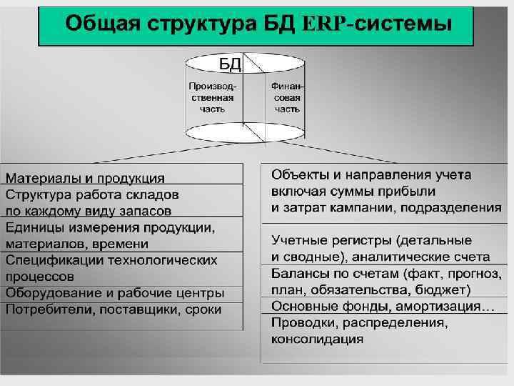 Основа ERP-системы принцип интеграции В основе ERP лежит принцип создания единого хранилища данных (repository), содержащего всю деловую информацию, накопленную организацией в процессе ведения деловых операций, включая финансовую информацию, данные, связанные с производством, управлением персоналом, или любые другие сведения. Любая часть информации, которой располагает данная организация, становится одновременно доступной для всех работников, обладающих соответствующими полномочиями.
