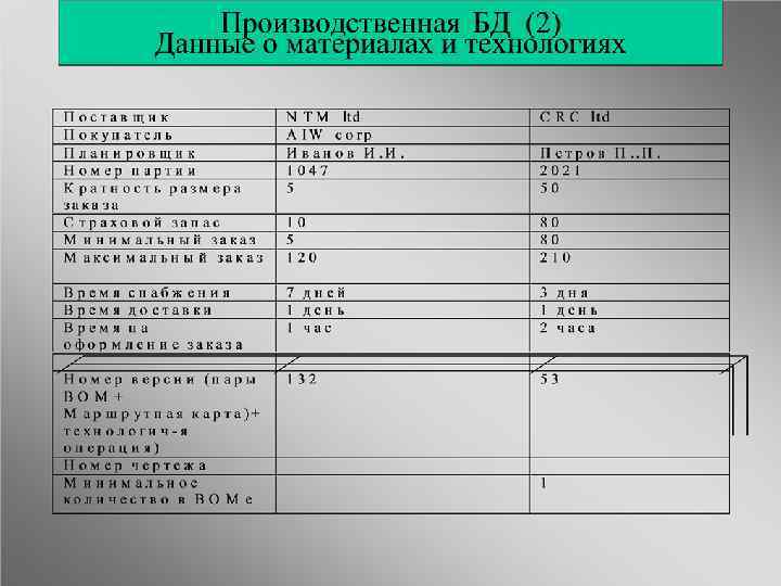 ERP: Планирование ресурсов производства (схема уровней планирования и управления Стратегический Уровень Корпоративные цели Прогнозирование Управление спросом Бизнеспланирование Заказы на продажу Планирование продаж и операций S 0 P Заказы на зап. части Разработка главного Календарного MPS плана Заказы со складов Заказы с других заводов Прогнозы Бизнесограничения Планирование потребности в Ресурсах RRP Тактический Уровень Укрупненное планирование потребности в Мощностях RCCP Планирование MRP потребностей в материалах План закупок План производства Оперативное управление цехом Управление закупками Учет продаж Учет закупок Производственный учет Главная книга Планирование потребностей в Мощностях CRP Управление входн. и выходн потоками Расчет издержек Оперативный Уровень