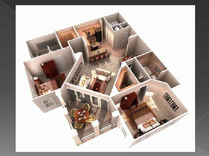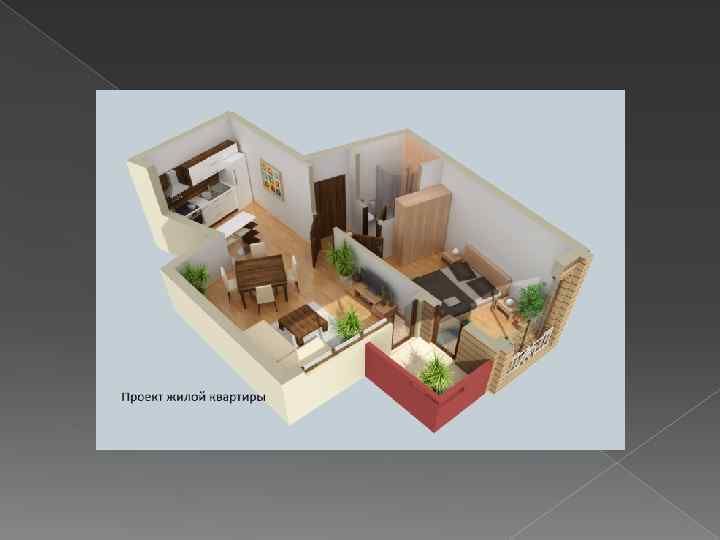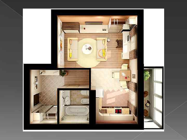 1. 4 Квартира и её элементы Квартира – это микросреда (помещения), в которой человеку приходится проводить большую часть своей жизни. Квартиры бывают: 1) в одном уровне. 2) в два уровня или больше. Принципы проектирования квартиры 1. Функциональное зонирование (т. е. предоставление каждому процессу жизнедеятельности части пространства, обеспечивающего условия для его осуществления) 2. Обеспечение автономности каждой из зон при рациональных их взаимосвязях Помещение - основной элемент пространственной организации квартиры, включающий одну или несколько зон бытовых процессов жизнедеятельности. По характеру использования все помещения квартиры можно разделить на 2 группы: жилые помещения (личные жилые комнаты и общесемейные) и подсобные помещения (личной гигиены, хозяйственные, коммуникационные).