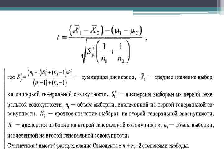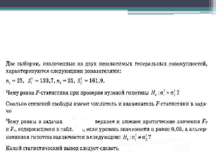ИСПОЛЬЗОВАНИЕ F - КРИТЕРИЯ ДЛЯ ОЦЕНКИ РАЗНОСТИ МЕЖДУ ДВУМЯ ДИСПЕРСИЯМИ • Для проверки равенства двух дисперсий в критерии используется F статистика, вы числяемая по формуле