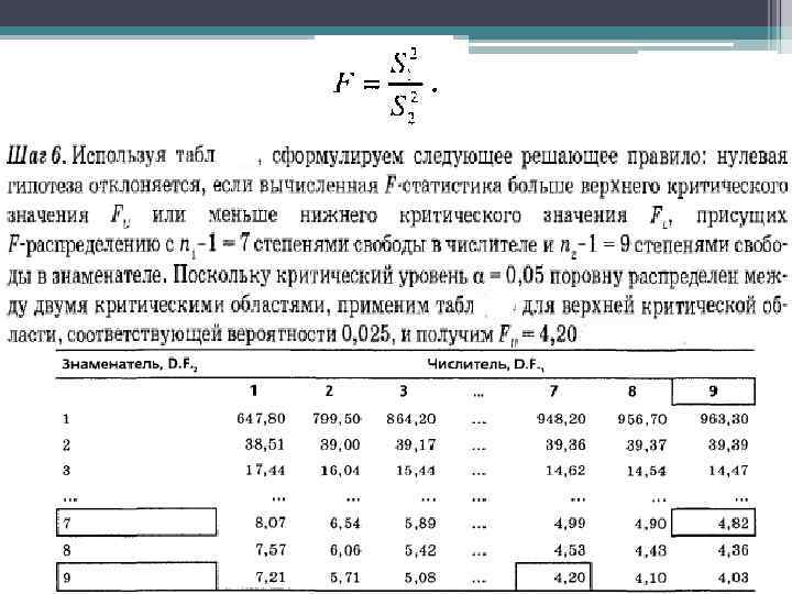 Определение верхнего критического значения • Пусть 2 выборки объемом 10 • В первой и второй выборках существуют 10 1 = 9 степеней свободы. • Верхнее и нижнее критическое значения F распределения определяются по таблице • Поскольку количество степеней свободы числителя и знаменателя равно 9, верхнее критическое значение следует искать на пересечении девятой строки и девятого столбца. • Таким образом, верхнее критическое значение F распределения равно 4, 03.