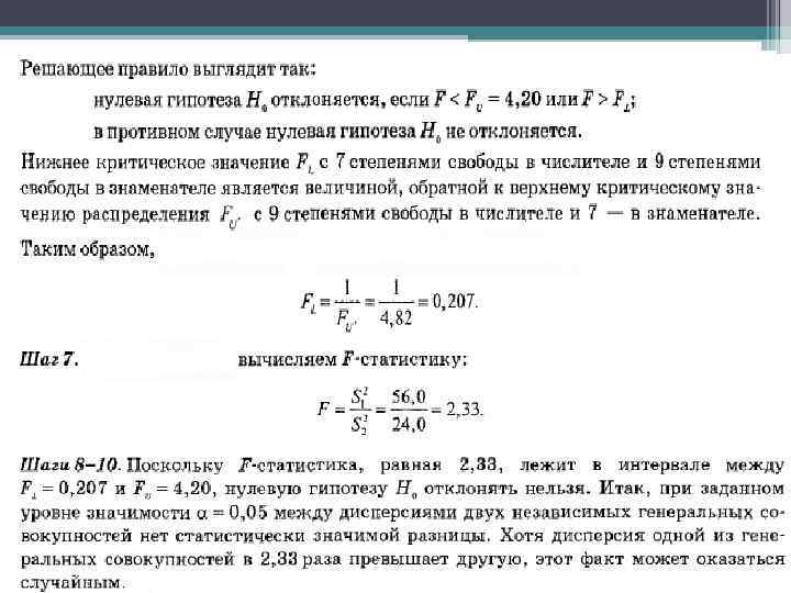 Вычисление нижнего критического уровня двустороннего F-критерия • Из нормально распределенной генеральной совокупности извлечена выборка, имею щая объем 1 = 8. Дисперсия п этой выборки равна 56, 0. Из второй распределенной генеральной совокупности, независимой от первой, извлечена выборка, имеющая объем п 2 = 10. Дисперсия этой выборки равна 24, 0. Проверьте нулевую гипотезу, • заключающуюся в том, что дисперсии двух генеральных совокупностей равны меж ду собой, и альтернативную гипотезу, состоящую в том, что между дисперсиями этих генеральных совокупностей нет существенной разницы. • Шаг 1 и 2. • Шаг 3. α = 0, 05. • Шаг п 1 = 8 , п 2 = 10 • Шаг 5. Предполагая, что выборки извлечены из независимых нормально распреде ленных генеральных совокупностей, вычислим F статистику:
