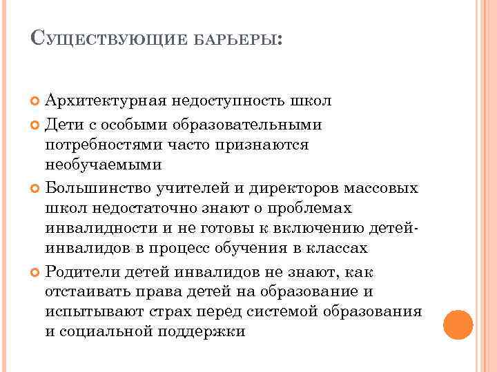СУЩЕСТВУЮЩИЕ БАРЬЕРЫ: Архитектурная недоступность школ Дети с особыми образовательными потребностями часто признаются необучаемыми Большинство учителей и директоров массовых школ недостаточно знают о проблемах инвалидности и не готовы к включению детейинвалидов в процесс обучения в классах Родители детей инвалидов не знают, как отстаивать права детей на образование и испытывают страх перед системой образования и социальной поддержки