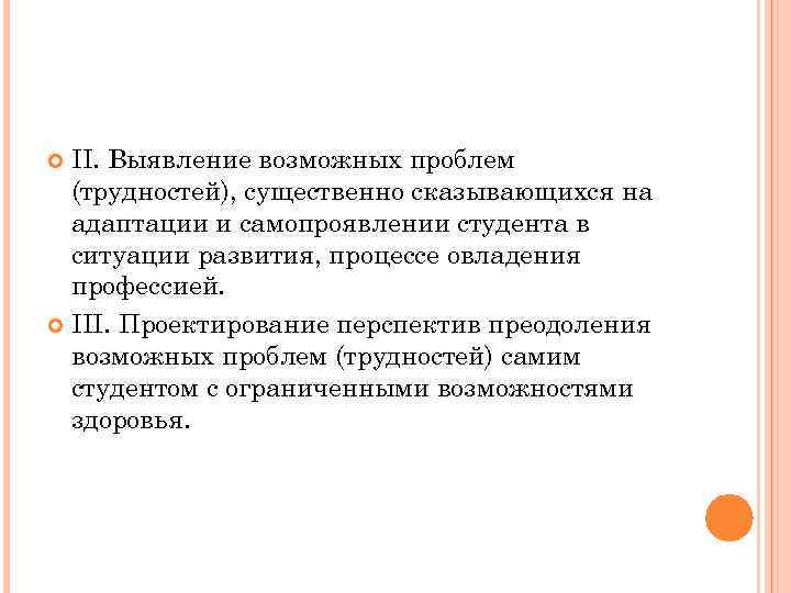 II. Выявление возможных проблем (трудностей), существенно сказывающихся на адаптации и самопроявлении студента в ситуации развития, процессе овладения профессией. III. Проектирование перспектив преодоления возможных проблем (трудностей) самим студентом с ограниченными возможностями здоровья.