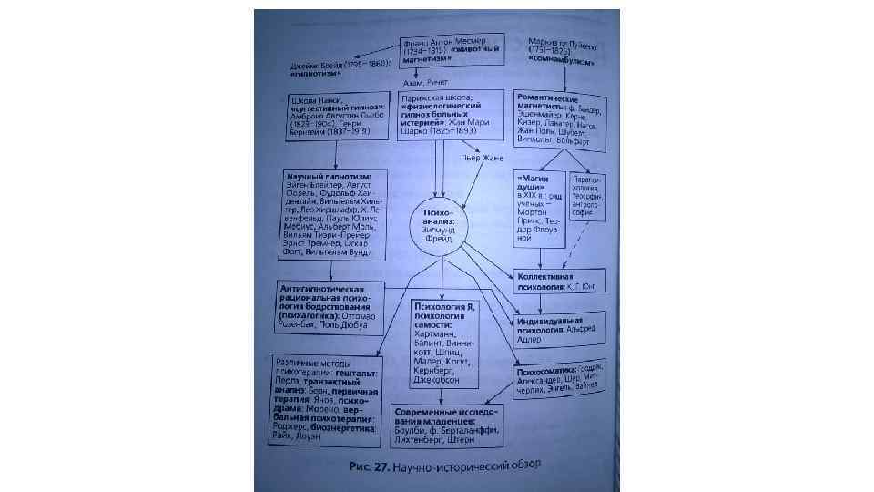 Франц Антон Месмер (нем. Friedrich Anton Mesmer; 23 мая 1734 - 5 марта 1815, Германия) • Франц Антон Месмер — родился в Швабии, немецкий врач, целитель, создатель учения о «животном магнетизме» ( «месмеризм» ). Изучал теологию и медицину в Венском университете. В 1766 году получил степень доктора медицины, защитив диссертацию «О влиянии звезд и планет как лечебных сил» . В дальнейшем занимался вопросами практического применения магнетизма. В 1776 году пришел к заключению, что магнитотерапия благоприятно действует на пациента, но не благодаря самому магниту, а в результате действия таинственной силы — флюида, исходящей от магнетизера. Эта сила, названная им «животным магнетизмом» , может накапливаться и передаваться другим с целью устранения болезней. Под влиянием этих идей Месмер разработал психотерапевтический прием лечения, который был назван им «бакэ» (от фр. baque — чан). Суть его в том, что несколько пациентов располагается вокруг деревянного чана с водой, в крышку которого через специальные отверстия вставлены намагниченные железные стержни. В условиях группового сеанса пациенты прикасались к ним и друг к другу, создавая цепь, по которой «циркулировал» флюид. Магнетизер при этом должен был коснуться чана, передавая через него целительную энергию всем пациентам одновременно. Месмер полагал, что в состоянии магнетического сна или транса некоторые люди могут предвидеть будущее и прозревать далекое прошлое, способны видеть внутренние органы — как свои, так и других людей, распознавать болезни, определять средства лечения и т. п. При этом механизм лечения имел, по его мнению, сугубо физиологическое, но не психологическое содержание. Он ввел термин «раппорт» , означающий физический контакт, благодаря которому происходила передача «флюида» . Впоследствии «раппорт» в гипнотерапии стал означать словесный контакт гипнотизера с пациентом, находящимся в гипнотическом состоянии. • Несмотря на критику теоретических положений метода Месмера, интерес к нему сохранялся, привлекая внимание ученых и врачей (И. Бернгейм, А. Льебо, Ж. Шарко и др. ). Феномен месмеризма способствовал к XIX веку формированию научных представлений о гипнозе и практических методов гипнотерапии. Оказал существенное влияние на философию романтизма[3].