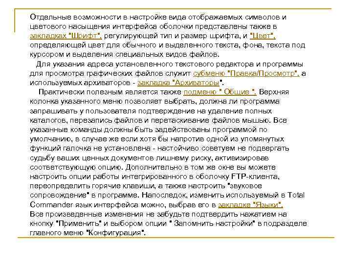 Отдельные возможности в настройке вида отображаемых символов и цветового насыщения интерфейса оболочки представлены также в закладках "Шрифт", регулирующей тип и размер шрифта, и "Цвет", определяющей цвет для обычного и выделенного текста, фона, текста под курсором и выделения специальных видов файлов. Для указания адреса установленного текстового редактора и программы для просмотра графических файлов служит субменю "Правка/Просмотр", а используемых архиваторов - закладка "Архиваторы". Практически полезным является также подменю " Общие ". Верхняя колонка указанного меню позволяет выбрать, должна ли программа запрашивать у пользователя подтверждение на удаление полных каталогов, перезапись файлов и перетаскивание файлов мышью. Все указанные команды должны быть задействованы программой по умолчанию, в случае же если хотя бы напротив одной из упомянутых функций галочка не установлена - настойчиво советуем не подвергать судьбу ваших ценных документов лишнему риску, активизировав соответствующую опцию. Дополнительно в том же окне вы можете настроить опции работы интегрированного в оболочку FTP-клиента, переопределить горячие клавиши, а также настроить "звуковое сопровождение" в программе. Напоследок, изменить используемый в Total Commander язык интерфейса можно, выбрав его в закладке "Языки". Все произведенные изменения не забудьте подтвердить нажатием на кнопку "Применить" и выбором опции " Запомнить настройки" в подразделе главного меню "Конфигурация".