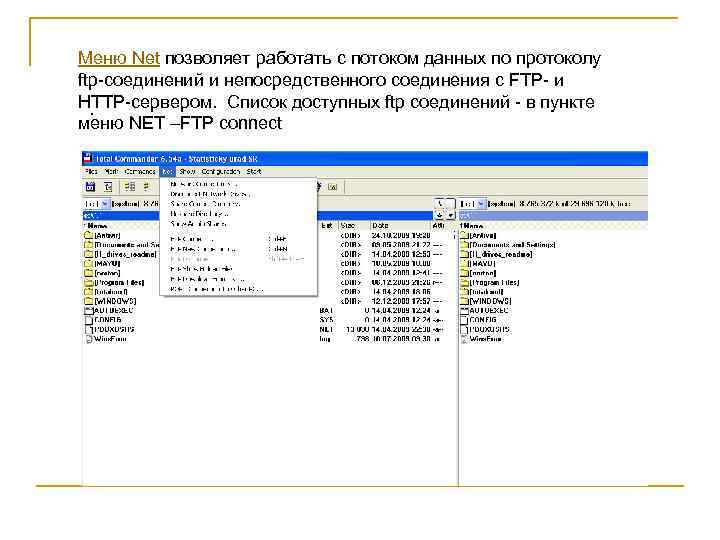 Меню Net позволяет работать с потоком данных по протоколу ftp-соединений и непосредственного соединения с FTP- и HTTP-сервером. Список доступных ftp соединений - в пункте . меню NET –FTP connect