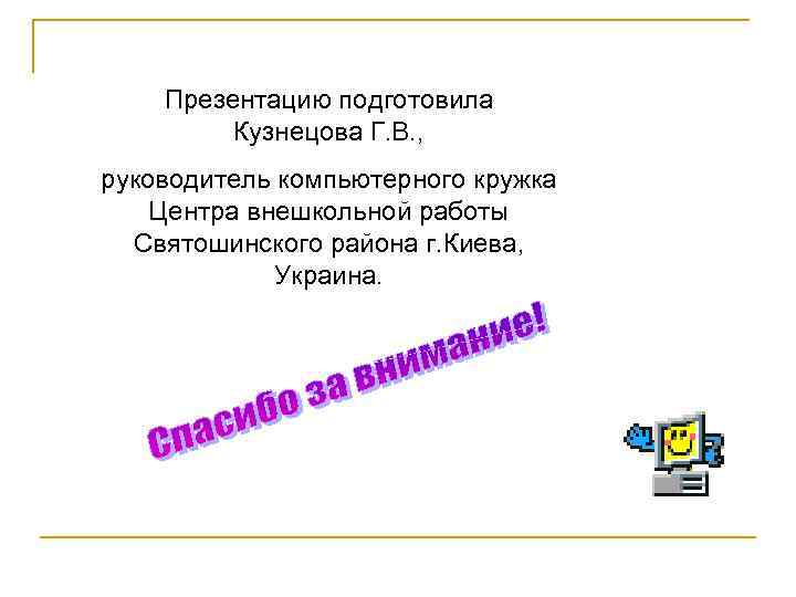 Презентацию подготовила Кузнецова Г. В. , руководитель компьютерного кружка Центра внешкольной работы Святошинского района г. Киева, Украина.