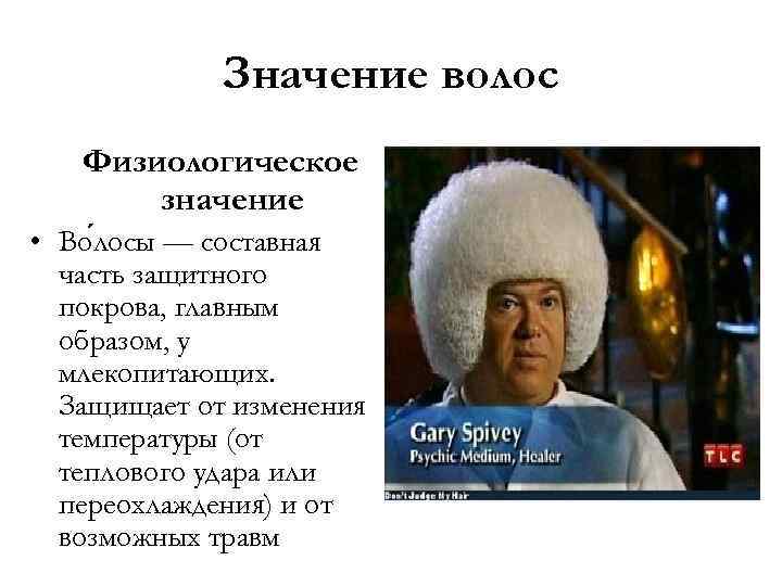 Значение волос Физиологическое значение • Во лосы — составная часть защитного покрова, главным образом, у млекопитающих. Защищает от изменения температуры (от теплового удара или переохлаждения) и от возможных травм