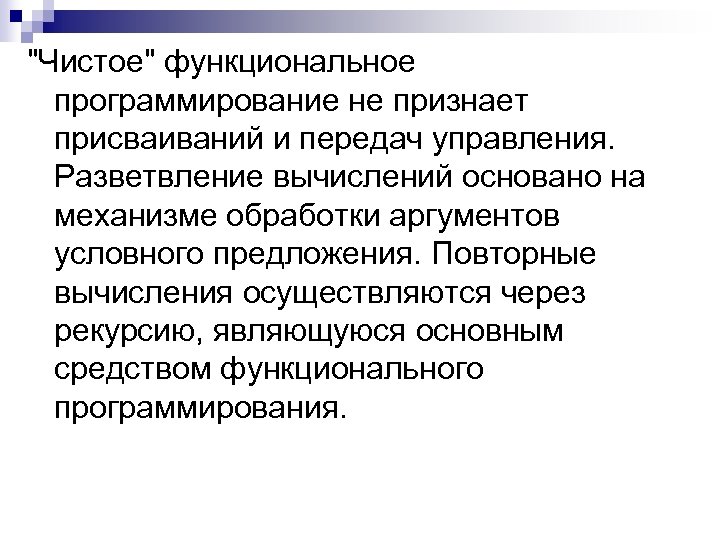 "Чистое" функциональное программирование не признает присваиваний и передач управления. Разветвление вычислений основано на механизме обработки аргументов условного предложения. Повторные вычисления осуществляются через рекурсию, являющуюся основным средством функционального программирования.