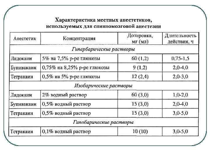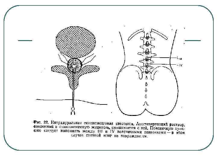 Спинномозговая анестезия (субарахноидальная, спинальная) l достигается введением раствора анестетика в субарахноидальное пространство после прокола твердой мозговой оболочки в каудальной части поясничного отдела позвоночника (люмбальной пункции). Обычно вводят 2 % лидокаин в дозе 1 мг/кг. Для улучшения и удлинения времени анальгезии можно ввести до 1 мл фентанила. (обычно достаточно 0, 3 мл, большая доза вызывает , особенно у пожилых людей, излишнюю седацию с угнетением дыхания) Уровень введения- между 2 -3 или 3 -4 поясничными позвонками. Выше делать пункцию нельзя, т. к. есть риск повредить спинной мозг. Обезболивание возникает через 3 -5 мин. Время действия СМА без фентанила- 40 -60 мин, с фентанилом -90 -120 мин. Современный препарат маркаин-спинал обеспечивает трехчасовое обезболивание без фентанила. Пациенты обычно чувствуют тепло, холод, прикосновение. Выключается только болевая чувствительность. Обычно, не могут двигать конечностями.