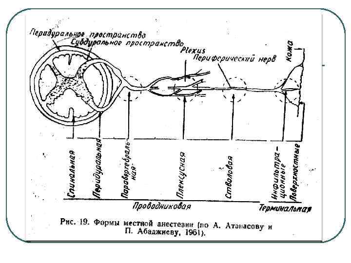 l l Цель местной анестезии – устранение болевых ощущений в ограниченной области путем прерывания нервной проходимости при одновременном сохранении сознания Сущность местной анестезии заключается в блокаде болевых импульсов из области операции, осуществляемой на разных уровнях, начиная от нервных рецепторов и завершая сегментами спинного мозга