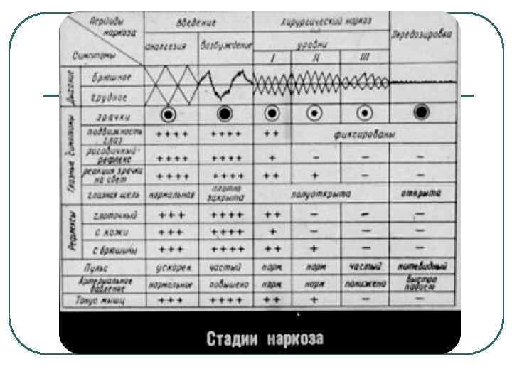 Основные клинические признаки оценки динамики наркоза l l l Сознание, общий вид больного Реакции на болевое раздражение Напряжение мышц, двигательная реакция Глазные симптомы-ширина зрачка, реакция на свет, роговичный рефлекс, движение глазных яблок Глоточные рефлексы и частота дыхания Пульс и АД