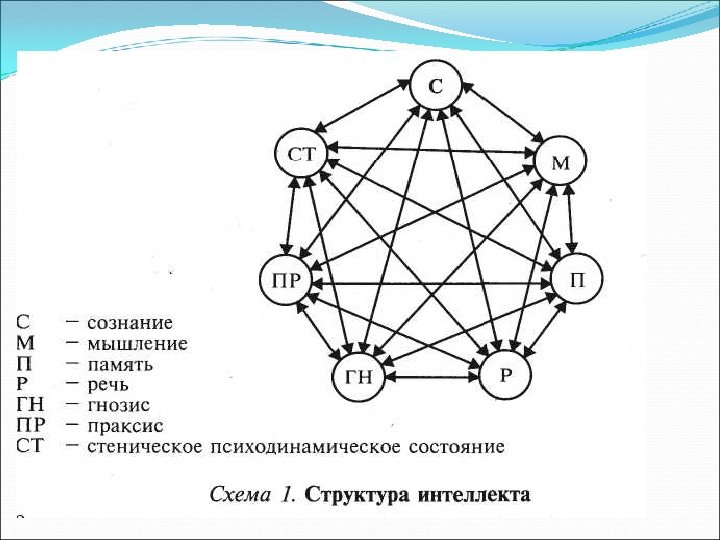 СТРУКТУРА ЛЕКЦИИ 1. Интеллект и его интегральная структура. 2. Структурно-функциональные блоки мозга. 3. Речь как интегральный компонент интеллекта. Классификация нарушений речи. 4. Гнозис как интегральный Классификация нарушений гнозиса. компонент интеллекта. 5. Праксис как интегральный компонент Классификация нарушений праксиса. интеллекта. 6. Память как интегральный Классификация нарушений памяти. интеллекта. компонент 7. Мышление как интегральный компонент интеллекта. Классификация нарушений речи мышления.