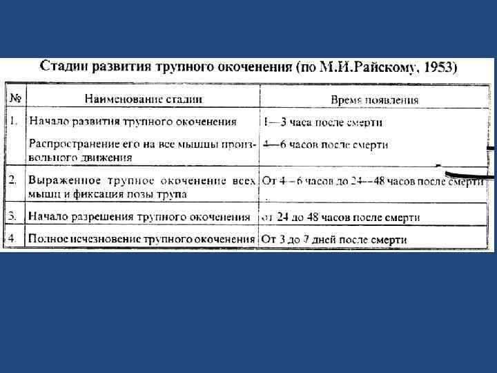 Трупное окоченение появляется через 1, 5 2 часа, после наступления смерти, причем при более высокой температуре окружающей среды оно развивается раньше, при более низкой температуре позднее. Трупное окоченение начинает развиваться одновременно во всех группах мышц тела, но реально определить его можно в различные периоды времени: первоначально окоченение развивается в мышцах лица, особенно рано оно появляется в жевательных, затем охватывает мышцы шеи, туловища, верхних и нижних конечностей путем развития по нисходящему типу Затем, в зависимости от условий нахождения тела трупное окоченение самопроизвольно начинает разрешаться. При оценке состояния трупного окоченения следует учитывать влияние температуры и влажности окружающей среды, состояние упитанности и возраст умершего, степень развития скелетной мускулатуры, а также причину смерти.