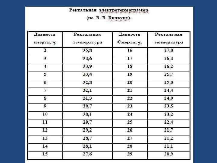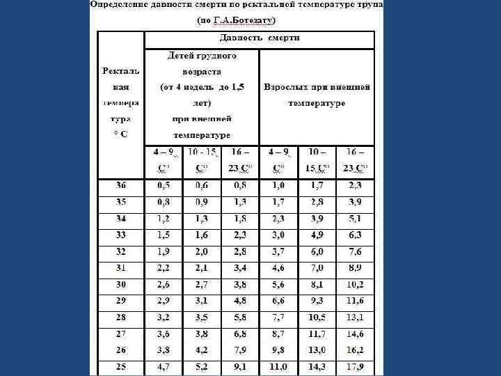 Трупное охлаждение происходит в результате преобладания процессов теплоотдачи над процессами теплообразования, происходящими в трупе, находящегося при температуре окружающей среды, которая ниже температуры тела. Оценку трупного охлаждения трупа осуществляют как на ощупь тыльной поверхностью ладони, так и с использованием специальных электротермометров. Объективным методом исследования является электротермометрия. При проведении термометрии установлено, что в подмышечных впадинах температура тела уравнивается с температурой окружающей среды через 16 часов, в прямой кишке через 19 часов, а в печени через 25 часов.