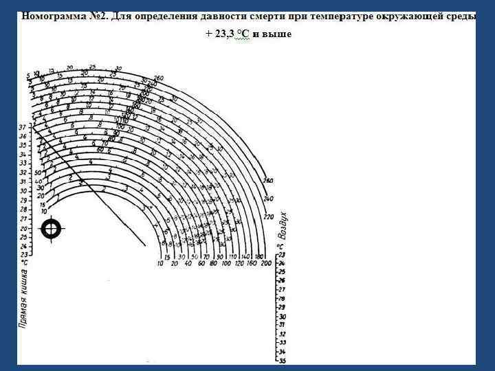 Порядок работы с номограммами: А) необходимо отметить ректальную температуру на левой шкале. Б) отметить температуру воздуха на правой шкале. В) соединить отмеченные точки прямой линией. Г ) отметить точку пересечения этой линии с постоянной диагональю номограммы. Д) от центра окружности в левой нижней части номограммы через точку, указанную в пункте 4, провести прямую линию до пересечения её с дугообразной кривой, соответствующей массе тела. Ж) в месте пересечения указана давность смерти (в часах).