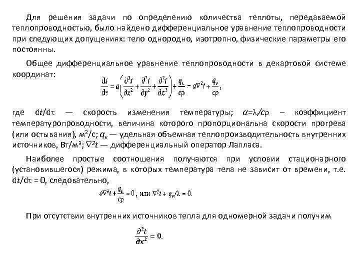 Для решения задачи по определению количества теплоты, передаваемой теплопроводностью, было найдено дифференциальное уравнение теплопроводности при следующих допущениях: тело однородно, изотропно, физические параметры его постоянны. Общее дифференциальное уравнение теплопроводности в декартовой системе координат: где dt/d — скорость изменения температуры; α= /c – коэффициент температуропроводности, величина которого пропорциональна скорости прогрева (или остывания), м 2/с; qv — удельная объемная теплопроизводительность внутренних источников, Вт/м 3; 2 t — дифференциальный оператор Лапласа. Наиболее простые соотношения получаются при условии стационарного (установившегося) режима, в которых температура тела не зависит от времени, т. е. dt/d = 0, следовательно, При отсутствии внутренних источников тепла для одномерной задачи получим