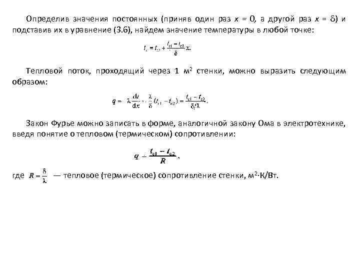 Определив значения постоянных (приняв один раз х = 0, а другой раз х = ) и подставив их в уравнение (3. 6), найдем значение температуры в любой точке: Тепловой поток, проходящий через 1 м 2 стенки, можно выразить следующим образом: Закон Фурье можно записать в форме, аналогичной закону Ома в электротехнике, введя понятие о тепловом (термическом) сопротивлении: где — тепловое (термическое) сопротивление стенки, м 2 К/Вт.