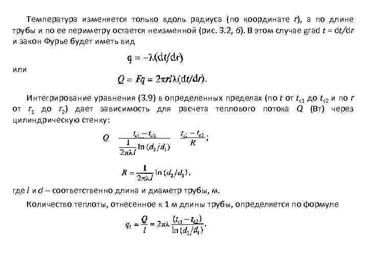 Температура изменяется только вдоль радиуса (по координате r), а по длине трубы и по ее периметру остается неизменной (рис. 3. 2, б). В этом случае grad t = dt/dr и закон Фурье будет иметь вид или Интегрирование уравнения (3. 9) в определенных пределах (по t от tc 1 до tc 2 и по r от r 1 до r 2) дает зависимость для расчета теплового потока Q (Вт) через цилиндрическую стенку: где l и d – соответственно длина и диаметр трубы, м. Количество теплоты, отнесенное к 1 м длины трубы, определяется по формуле