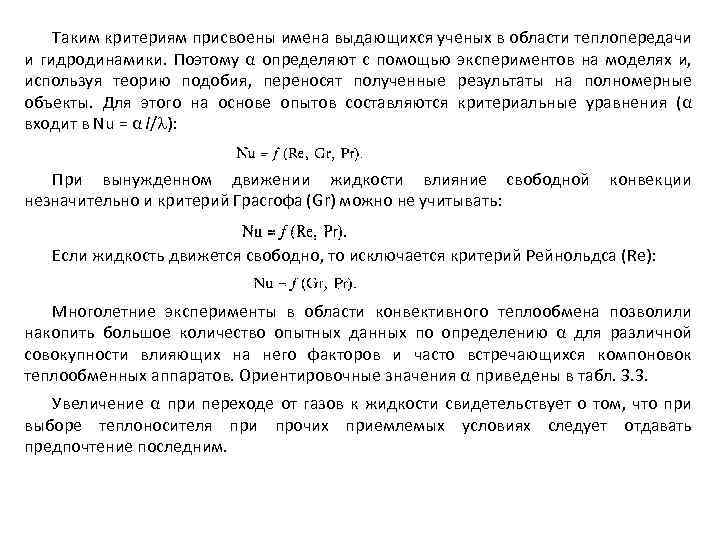 Таким критериям присвоены имена выдающихся ученых в области теплопередачи и гидродинамики. Поэтому α определяют с помощью экспериментов на моделях и, используя теорию подобия, переносят полученные результаты на полномерные объекты. Для этого на основе опытов составляются критериальные уравнения (α входит в Nu = α l/ ): При вынужденном движении жидкости влияние свободной конвекции незначительно и критерий Грасгофа (Gr) можно не учитывать: Если жидкость движется свободно, то исключается критерий Рейнольдса (Re): Многолетние эксперименты в области конвективного теплообмена позволили накопить большое количество опытных данных по определению α для различной совокупности влияющих на него факторов и часто встречающихся компоновок теплообменных аппаратов. Ориентировочные значения α приведены в табл. 3. 3. Увеличение α при переходе от газов к жидкости свидетельствует о том, что при выборе теплоносителя при прочих приемлемых условиях следует отдавать предпочтение последним.